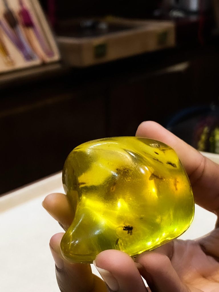 هذه صخرة الكهرمان فيها حشرات عمرها ملايين السنين يصنعون منها المسابيح والمنحوتات من مواد صمغية كانت تظهر على الاشجار في بحر البلطيق اسعارها تتراوح من 300لي1500دينار وعلى حسب ندرة الحشرة الموجودة فيها